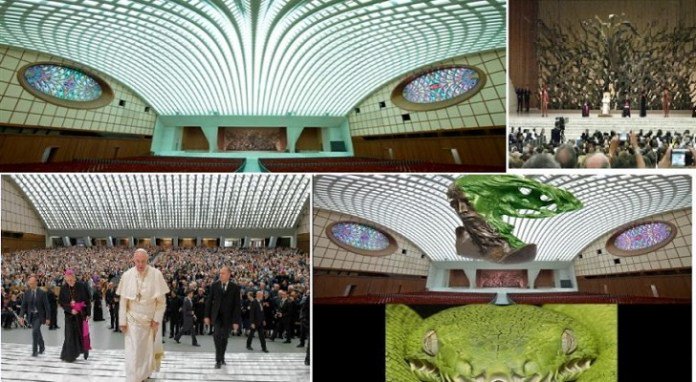 Derrière la salle d'audience du pape, il y a la représentation reptilienne de Satan-Lucifer: c'est la Lumière des Frères.