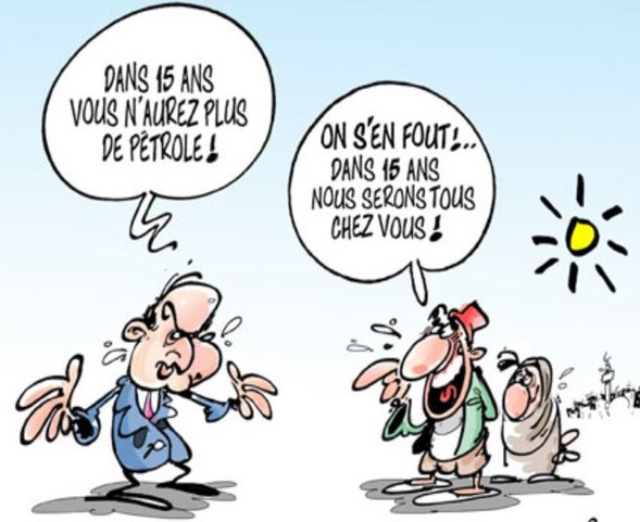 > Dessin réalisé par le caricaturiste Dilem, publié dans l'édition du quotidien algérien «Liberté »,sous le titre: « Exploitation du gaz de schiste :Macron veut convaincre les Algériens".